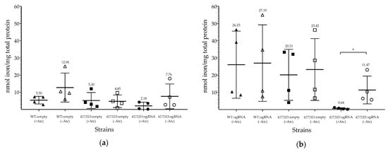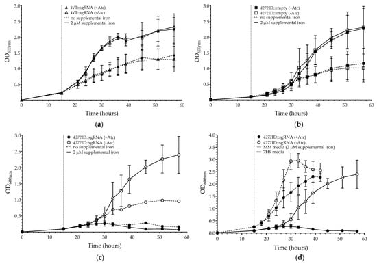 ATC proteins are proposed to function as iron chaperones or to contribute to the intracellular iron pool. We, therefore, investigated the impact of transcriptionally silencing MSMEG_4272 on growth in Chelex-treated MM media, with (iron-replete conditions) or without (iron limiting conditions) supplemental iron (Figure 5). Consistent with previous reports, irrespective of Atc addition, a significant reduction in growth (OD600) was observed for all strains under iron limiting conditions, when compared to iron-replete conditions after 57 h of culturing (WT::sgRNA (without Atc, p = 0.028) and 4272ID::sgRNA (without Atc, p = 0.029)) []. For 4272ID::empty with Atc, WT::sgRNA with Atc, and 4272ID::sgRNA without Atc, no significant difference in their growth was observed when compared under either iron limiting or iron-replete conditions.