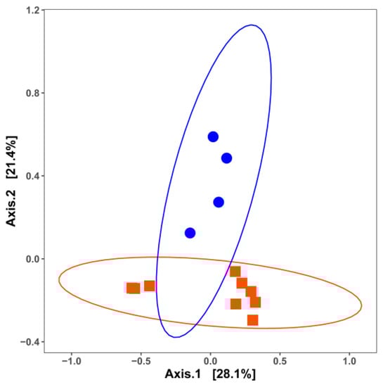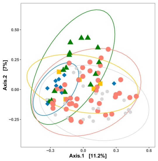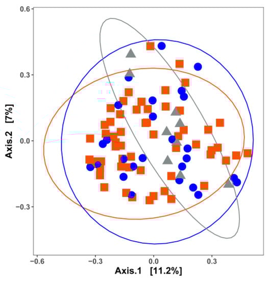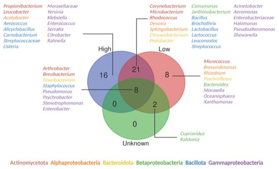 We classified direct food contact surfaces and floor drains as “high-nutrient” areas, as these areas are characterized by the presence of product residue during processing. Non-food-contact surfaces, walls and water hoses were characterized as “low-nutrient” areas because they are unlikely to provide organic matter to support bacterial growth. The nutrient levels of floors were categorized as “unknown”. This differentiation does not account for the type of substrate (lipids, carbohydrate/sugars or proteins/amino acids), and the types of nutrients can only partially be inferred from the type of product that is processed in the specific facilities. Overall, the compositions of bacterial communities in sites with different nutrient availabilities differ (p < 0.05) (Figure 1). The bacterial community in high-nutrient surfaces differs from that in unknown surfaces (p = 0.036). Plotting the data separately by commodity revealed a partial overlap in the compositions of bacterial communities in sites with high, low and unknown nutrient availability (Figure S1), with the exception of cheese processing facilities, where high- and low-nutrient surfaces differed significantly (p < 0.05). The similarity of the bacterial composition between different nutrient levels within one food commodity may be attributed to the smaller sample size of sites with low or unknown nutrient availability. In contrast, MCA visualized a largely distinct composition of bacterial communities in sites with different nutrient availability with the individual taxon as input (Figure S2).