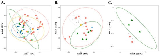 Principal coordinate analysis (PCoA) with Jaccard index for bacterial diversity based on 5 food processing facilities associated with different nutrient levels. Points represent microbial communities collected from different processing facilities and are clustered based on the same nutrient level: (A) high; (B) low; (C) unknown. Light grey, cheese processing facilities; green, fresh produce processing facilities; red, meat processing facilities; yellow, RTE processing facilities; blue, seafood processing facilities. Permutational multivariate analysis of variance was used to statistically differentiate among bacterial communities. The associations of community variance with different food commodities for high- and low-nutrient surfaces are displayed in Supplementary Tables S3 and S4, respectively.