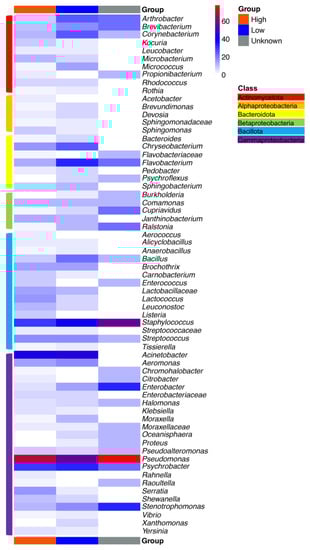 Heatmaps depicting the percentages of samples in which specific taxa were present are shown in Figure 5 and Figure 6. The heatmaps were scaled to show the number of samples that tested positive for a specific taxon divided by the total number of samples. The majority of taxa depicted in the heatmaps were identified at the genus level, but some provided only family-level identification. The heatmaps shown in Figure 5 and Figure 6 differentiate samples by nutrient level and commodity, respectively. Overall, Pseudomonas, Stenotrophomonas, Acinetobacter, Serratia, Microbacterium, Psychrobacter and Staphylococcus were frequently present regardless of the food commodity, with Pseudomonas species as the most prevalent taxa (Figure 5). Meanwhile, the compositions of the bacterial communities also differed among facilities processing different food commodities.