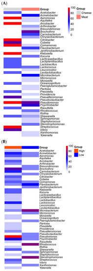 The relative abundance of bacterial genera residing in biofilm consortia based on different food categories (A) and nutrient levels (B). Data collected from two meat processing facilities and one cheese processing facility, contributing to 13 sampling surfaces in total.