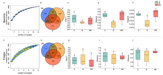 Alpha diversity of rhizosphere microbial communities. The species accumulation curves of bacteria (A) and fungi (F). Venn diagrams were created for bacteria (B) and fungi (G) identified in the three groups. Box plots show the variation of Chao1 index (C,H), Shannon index (D,I), and Simpson index (E,J) for bacteria and fungi from the three groups. Different letters within the graph indicate significant differences between the means (p < 0.05).