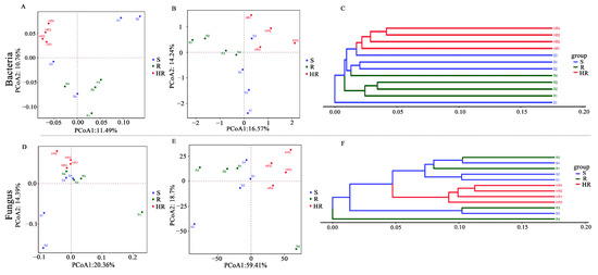 A PCoA analysis was performed using weighted unifrac and unweighted unifrac bacterial and fungal OTUs based on the combined sequences of 16S rRNA genes and ITS fragments in soil samples to visualize the similarities and dissimilarities between microbial communities (Figure 2A,B,D,E). UPGMA cluster analysis based on a sample distance matrix was used to show the similarities between samples (Figure 2C,F). Using weighted unifrac-based PCoA analysis (Figure 2A,D), only the microbial abundance in the sample was considered. The results showed that the bacterial community of HR could be distinguished from R and S, while R and S could not. The fungal abundance in the three sample groups was similar. Using PCoA analysis based on unweighted unifrac analysis (Figure 2B,E), only the microbial structure in the sample was considered, enabling the bacterial and fungal structures among HR, R, and S to be distinguished. This result indicates that there were differences in the bacterial and fungal community structures among HR, R, and S. UPGMA cluster analysis showed that the bacterial and fungal community structures were not similar between HR and R and S (Figure 2C,F). However, the fungal community structures of R and S were similar. The results of the α and β diversity analysis showed that the microbial community structure of HR was different from that of R and S.