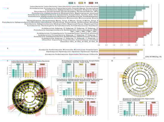 The following supporting information can be downloaded at: https://www.mdpi.com/article/10.3390/microorganisms11061576/s1, Table S1: Soil physical and chemical properties of HR, R and S; Table S2: Bacterial alpha diversity index table; Table S3: Fungal alpha diversity index table; Figure S1: The taxo-nomic cladogram showed the main bacterial (A) and fungal (B) taxa in the sample community from phylum to genus (from inside to outside). The size of the node corresponds to the average relative abundance of the classification unit; hollow nodes represent groups with no significant difference between groups, while nodes of other colors indicate that these groups show significant differences between groups, and the groups represented by colors are more abundant in the sample. The histogram showed the relative abundance of bacteria (A) and fungi (B) in the three sample groups; Figure S2: Prediction and comparison of rhizosphere bacterial community functions. The changes of bacterial functional group composition were inferred by PICRUSt2. STAMP software was used to analyze the difference of KEGG function between HR and R (A) and HR and S (B), and Welch’s two-sided t-test and Bonferroni multiple test correction method was used. The abscissa of the left column graph represents the average value of a certain function percentage, the ordinate represents the function name, and different colors represent different groups. The figure on the right represents the proportion of species abundance differences within the set confidence interval; Figure S3. Prediction and comparison of rhizosphere fungal community functions. The changes of bacterial functional group composition were inferred by FUNGuild. STAMP software was used to analyze the difference of KEGG function between HR and R (A) and HR and S (B), and Welch’s two-sided t-test and Bonferroni multiple test correction method was used. The abscissa of the left column graph represents the average value of a certain function percentage, the ordinate represents the function name, and different colors represent different groups. The figure on the right represents the proportion of species abundance differences within the set confidence interval.