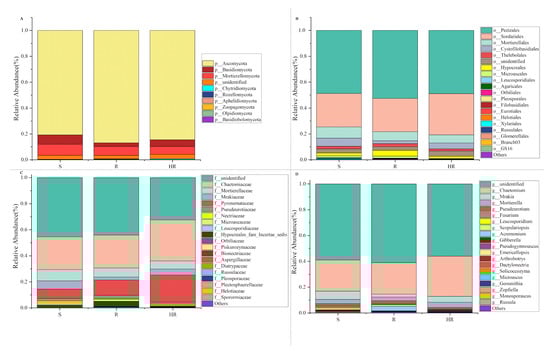 A histogram (relative abundance) of fungal community composition at the phylum (A), order (B), family (C), and genus (D) levels (top 20).