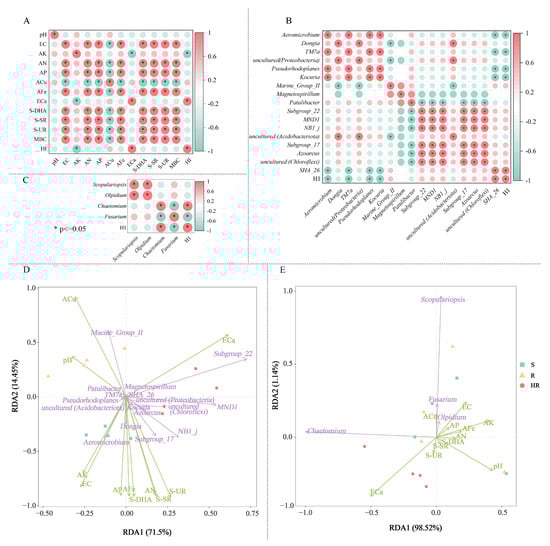 The correlation analysis heatmap of soil factors of HR, R, and S with screened bacteria (A) fungi (B), key bacteria, and fungi (C). Redundancy analysis (RDA) of the relationship between soil bacterial (D) and fungal (E) community structure and soil factors under different groups. In the correlation analysis, the legend shows the correlation coefficient value, red represents the positive correlation, blue represents the negative correlation; color depth indicates the strength of the correlation; * p < 0.05. In RDA analysis, the green arrows represent key bacteria and fungi at the genus level, whereas soil factors are shown with red arrows. Correlation between soil factors (ACu, AFe, ECa, EC, OM, MBC, S-DHA, S-UR, S-SR) and RDA axes are shown by both length and angle of arrows.