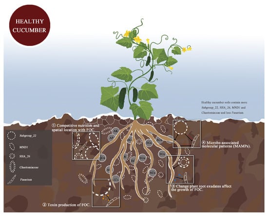 Plants with a healthy rhizosphere, lightly afflicted plants, and severely afflicted plants differ significantly in their rhizosphere soil microbial community composition. In maintaining plant health, the rhizosphere microbiota plays a key role [61]. Some evidence indicates that microbial communities differ between suppressed soils and favorable soils, with suppressed soils showing a greater abundance of taxa associated with disease suppression [14]. The microbiome of the rhizosphere of healthy plants may, therefore, be able to control soil pathogens such as wilt. In this study, Acidobacteriota Subgroup_22, Chloroflexi SHA_26, and MND1 were significantly enriched in the rhizosphere soil of healthy plants. Many studies showed that Acidobacteriota are associated with a variety of diseases. At present, there is no experimental evidence demonstrating that Chloroflexi SHA_26 and MND1 have a preventive effect on cucumber Fusarium wilt, but they are known to be beneficial to plant growth. Chaetomium, which has an inhibitory effect on pathogenic bacteria, is also abundant in the rhizospheres of healthy plants. However, it is not sufficient to interpret these differences as a result of soil–plant interactions. Studies are needed to determine how these microbial and chemical properties directly affect plant health. Finally, we combined correlation analysis to draw a possible mechanism map, revealing that environmental factors, rhizosphere bacteria, and fungi inhibit the occurrence of Fusarium wilt through four possible pathways (Figure 9). Whether the specific microbial communities and soil factors in the rhizosphere soil of healthy cucumbers have the ability to inhibit disease remains to be determined in future studies.