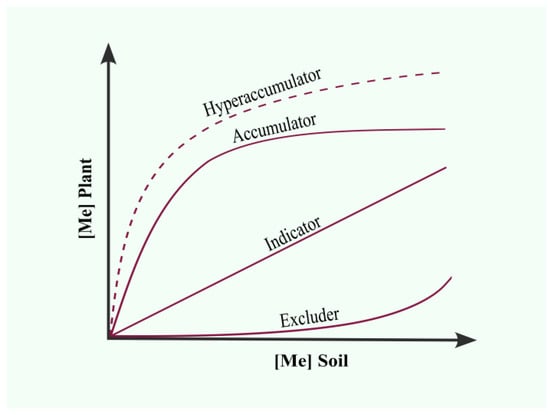 HM-tolerant plants can grow in the presence of metals; however, they behave differently according to species and genotype [20]. Plants have been grouped into excluders, indicators, and accumulators according to the HM concentration they can store in their tissues, regarding the amount found in the soil (Figure 1) [20,21].