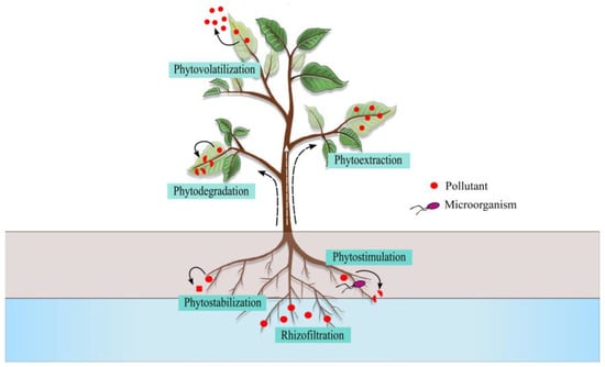 The elimination or transformation of contaminants from soil, water, or sediments by phytoremediation is carried out using at least one of the following processes: phytoextraction, phytovolatilization, phytostabilization, rhizofiltration, phytodegradation, or phytostimulation (Figure 2). Each phytoremediation process uses a different contaminant treatment mechanism (Table 1).