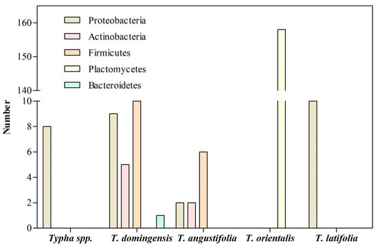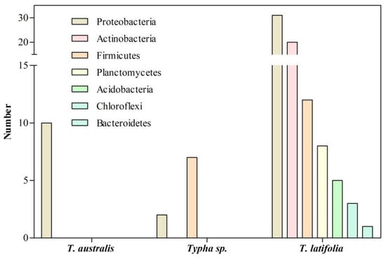 - Li, Y.H.; Zhu, J.N.; Liu, Q.F.; Liu, Y.; Liu, M.; Liu, L.; Zhang, Q. Comparison of the Diversity of Root-Associated Bacteria in Phragmites australis and Typha angustifolia L. in Artificial Wetlands. World J. Microbiol. Biotechnol. 2013, 29, 1499–1508. [Google Scholar] [CrossRef]