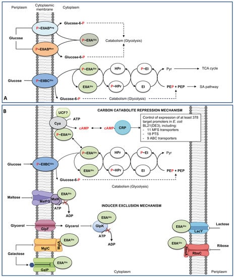 Environmental bacterial communities require efficient mechanisms to adapt to nutrient (carbohydrates) availability, leading to the modulation of the expression of different transporter systems with different affinities and capabilities, promoting the transport and catabolism of available sugars. In E. coli, as in many bacteria, the PTS sugar systems are the primary type of sugar transport; they mediate the concomitant uptake and phosphorylation of specific carbohydrates (PTS sugars) but additionally have a preponderant role both in the control of carbon and nitrogen metabolisms. In the presence of carbohydrate mixtures (PTS and non-PTS sugars), including glucose, PTS is induced, senses, and controls the preferential uptake and catabolism of this sugar over other available non-PTS carbohydrates in the mixture by the Catabolite Control Repression (CCR) and inducer exclusion mechanisms [,,,,]. PTS is a primary regulator of other cellular processes such as transcription and antitermination mechanisms, chemotaxis toward PTS sugars, or cell surface rearrangements [,,,,].