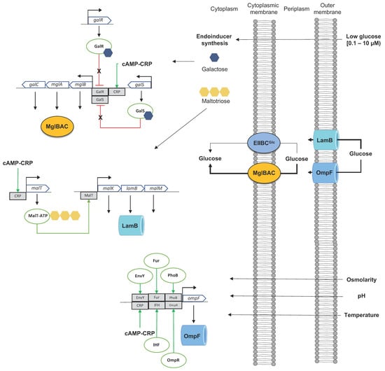 Despite the essential role of the PTS glucose system in glucose transport and phosphorylation in E. coli, as well as in controlling the preferential consumption of glucose over other non-PTS sugars, the cultivation of E. coli under nutritional stress conditions results in a differential expression and synthesis of other transport systems nor PTS Glc for glucose transport. Nutritional stress conditions under glucose-limited cultivation (1–300 μM, defined as a hunger condition) or under glucose starvation conditions (<0.1 μM) (growing under glucose-limited chemostat) result in lower specific growth rates (0.1–0.9 h−1) [,]. Under these scavenging conditions, E. coli activates the transcription and translation of alternative, high-affinity transporters for glucose such as several ABC transporters []. This process starts with the synthesis of the endogenous inducers galactose and maltotriose [], which induces, respectively, the expression of the operon mglBAC (member of the gal regulon), the operons malEFG (maltose ABC transporter), the malKlamBmalM operon encoding for the maltose ABC transporter ATP binding subunit (MalK), the maltose outer membrane channel/phage lambda receptor protein (LamB), and the maltose regulon periplasmic protein (MalM), both part of the mal regulon [,]. Additionally, the glucose limitation condition results in elevated levels of cAMP compared to the concentration when growing in high glucose concentration, activating the expression of the above operons [,,] (Figure 3).