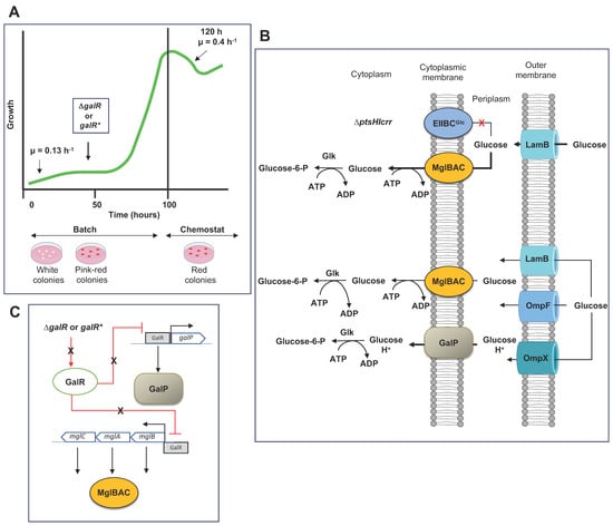 Selection of alternative glucose transporters during adaptive laboratory (ALE) experiments of a ΔptsHIcrr mutant (PTS−) of E. coli JM101. (A). ALE experiment with two-stage batch-chemostat stages in M9 minimal medium supplemented with glucose. The bold green line shows the overall growth profile starting with a μ = 0.1–0.13 h−1. PTS mutants in the early stage of the ALE experiment showed a white-color phenotype in MacConkey agar supplemented with glucose selecting LamB to diffuse extracellular glucose from the extracellular medium into the periplasm and MglBAC to transport glucose from the periplasm into the cytoplasm. (B). Analysis of several intermediate mutants indicated that in the absence of PTS (ΔptsHIcrr) mutants in the early stages of the ALE experiment selected, MglBAC for glucose transport (upper section). After 100 h of cultivation, the ALE experiment switched on a chemostat stage, isolating red colonies with increased μ values. Fast-growing mutants showed a μ = 0.4 h−1, and further analysis showed that mutants selected GalP as the primary glucose transporter (bottom section). Bold arrows show a higher glucose transport. (C) shows the regulatory mechanisms resulting in the selection of MglBAC and GalP as alternative glucose transporters without the activity of PTS glucose. Proposed induction and synthesis mechanisms for LamB are illustrated in Figure 3. galR*, mutated galR. Glk, glucokinase. OmpF, outer membrane porin; F OmpX, outer membrane porin X or OmpP. Red lines show repression mechanisms. Gray rectangles show specific DNA-binding transcriptional regions. This figure was composed of references [,,,,,].