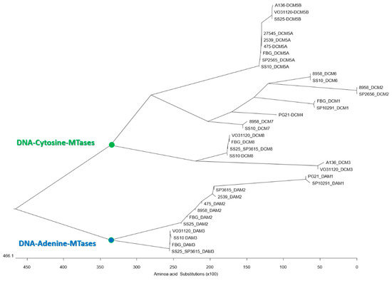 Methylation is the main epigenetic modification of bacterial DNA [8], and the repertoire of DNA MTases represents a characteristic signature of the respective strain, associated with vitality, defence, and virulence [9]. DNA MTases transfer a methyl group from S-adenosine-L-methionine (SAM or AdoMet) to the N6 position of adenine (6mA MTases) or the N4 or C5 position of cytosine (4mC or 5mC MTases) of a specific recognition sequence [10]. The exocyclic N-targeting, N-6-adenine, and N-4-cytosine MTases contain nine conserved domains [11] and are subdivided into six groups (α, β, γ, ξ, δ, and ε) due to their SAM binding site (motifs X, I–III), catalytic site (motifs IV–VIII), and target recognition site (TRD) [12], whereas C-5 MTases contain 10 motifs (I–X) in a common two-domain architecture ([I–VIII]—TRD-[IX–X] [13,14,15]), of which six motifs (I, IV, VI, VIII, IX, and X) are higher conserved [15,16,17].