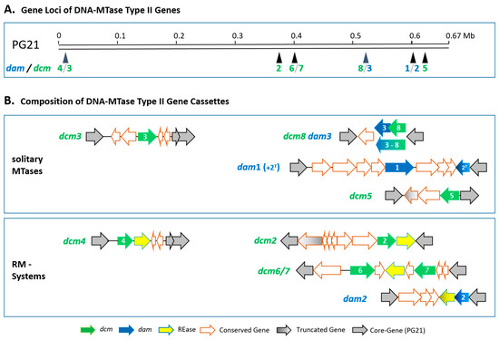 Type II DNA MTase gene loci and cassettes. (A) Position of the DNA MTase gene loci with respect to the genome sequence of ATCC23114 (type strain PG21); dam loci (1–3) in blue, dcm loci (1–8) in green. (B) Composition of the MTase gene loci. Genes are represented by arrows and coloured as follows: chromosomal core genes (accord. to PG21) in grey, conserved genes in the MTase cassettes (red), dam homologs in blue, dcm homologs in green, restriction endonuclease (REase) genes in yellow with blue frame; genes, in some isolated affected by truncation, are shaded.