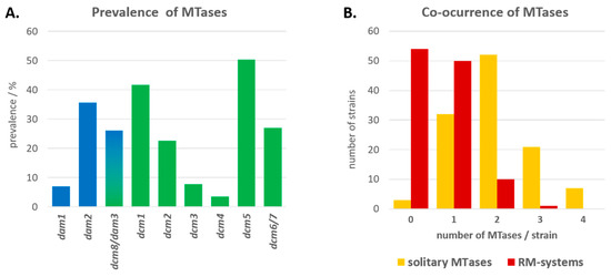 Prevalence and co-occurrence of type II DNA MTases in M. hominis. (A) Bargraphs of the different dam (blue) and dcm (green) gene prevalence (%) calculated on presence in the 115 M. hominis strains tested (Kruskal-Wallis p = 2.33 × 10−54). (B) Bargraphs of the number of M. hominis strains with zero to four different solitary MTases (orange) or MTases of RM systems (red). The combination of dam and dcm genes in view on solitary- and RM-MTases is listed in Table S3 for all strains (Mann–Whitney U p = 0.556).