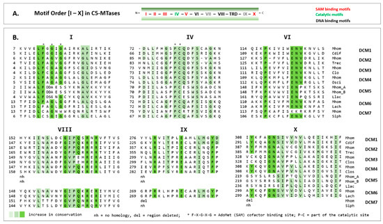 As shown in Figure 5A five motifs (I–III, V, and X, coloured in red) are known to take part in the SAM-binding domain and one motif (IV, coloured in green) to be part of the catalytic domain in C5 MTases. Six motifs (I, IV, VI, VIII, IX, and X), which were more highly conserved, were analysed in more detail in DCM1 to DCM7 in a multiple sequence alignment (Figure 5B), each with a respective non-mollicutes homolog (Table 3).