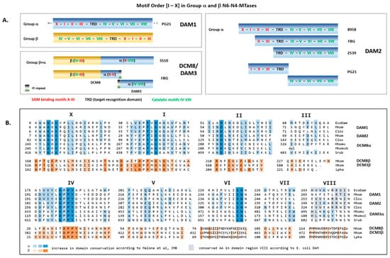 N-6-adenine and N-4-cytosine MTases are subdivided into six groups based on group-specific motif conservations. DAM1 and DAM2 were assigned to belong to the α group with the SAM-binding motifs X, I–III (coloured in red) N-terminal to the TRD region and the catalytic motifs IV–VIII (coloured in green) C-terminal (Figure 6).