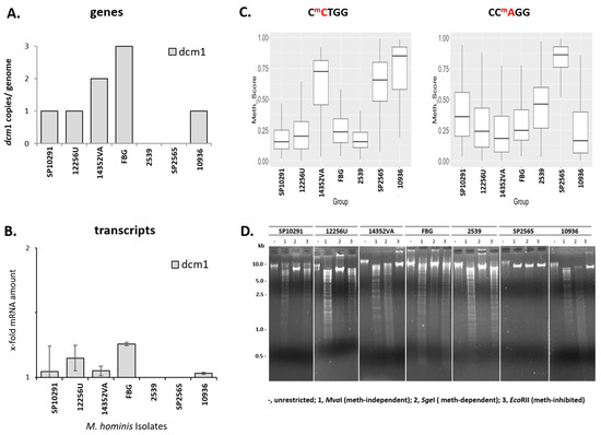 Five strains (SP10291, 12256U, 14532VA, FBG, and 10936) were dcm1 genes and transcript positive (Figure 7A,B), but only strains 14352VA and 10936 expressed DCM1 activity. The DNA of these strains, with calculated methylation scores ≥ 0.7, was cut by methylation-dependent restriction endonuclease SgeI but not methylation-sensitive EcoRII, demonstrating CmCTGG methylation (Figure 7D). The DNA of the dcm1-positive strain, SP10291, 12256U, and FBG, with calculated CmCTGG methylation frequencies <0.25, showed restriction patterns of non-methylated CCWGG, such as the dcm1-deficient strain 2539 (Figure 7D). Strain SP2565, which was also dcm1 gene- and transcript-negative (Figure 7A,B), had methylation scores of 0.7 for CmCTGG and 0.9 for CCmAGG (Figure 7C). As the methylation-sensitive restriction pattern of strain SP2565 correspond to its genetic dcm1 deficiency, a Tombo-calculated 5mC methylation score of 0.7 for CmCTGG was suggested to be based on a cross-detection of the 6mA methylation of CCmAGG (Methylation Score 0.9).