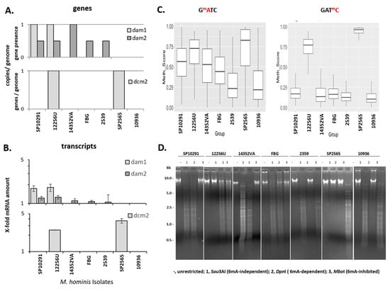 Proof of DAM1 and DAM2 activity in MSR analysis. (A) Presence of full-length genes was assigned a value of 1, truncated genes a value of 0.5, and absent genes a value of 0. (B) Relative transcript levels of dam1, dam2, and dcm2, calculated to the mean of three housekeeping genes (gap, mho_0150, and lgt) with the standard deviation of two independent cultures, each tested in duplicates. (C) Plots of methylation scores calculated with tailored Tombo (GmATC Kruskal–Wallis chi-squared = 4365.2, df = 6, p-value < 2.2 × 10−16, GATmC Kruskal–Wallis chi-squared = 10,077, df = 6, p-value < 2.2 × 10−16). (D) MSR analysis. Restricted DNA was separated on 1% (w/v) agarose gels.