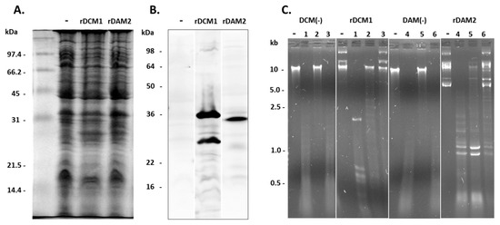 rDCM1 and rDAM2 expression led to respective methylation activity of transformed E. coli. Coommassie blue staining of total protein (A) and immunostaining of histidine-tagged proteins (B) in cell lysate of dam-/dcm-deficient E. coli (−), transformed by pcDNA3.1-(codon-optimized) dcm1 of PG21 (rDCM1) or –(codon-optimized) dam2 of 8958 (rDAM2). (C) MSR analysis of the respective genomic E. coli DNAs; unrestricted (DCM(−) and DAM(−)) or restricted with MvaI (1), SgeI (2), and EcoRII (3) for rDCM1 clone and restricted with Sau3AI (4), DpnI (5), and MboI (6) for rDAM2 clone.
