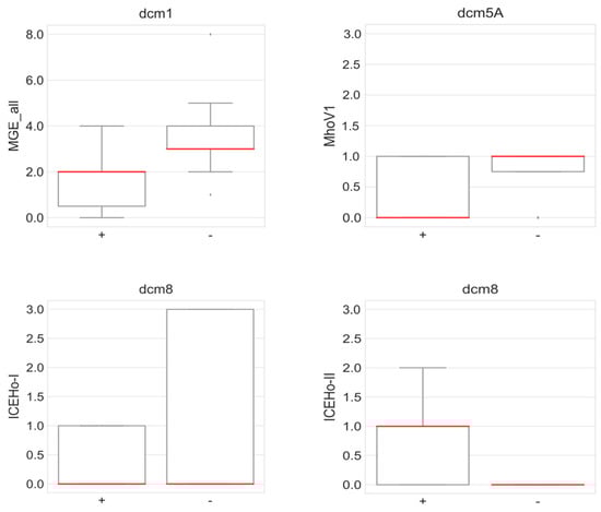 Boxplots of MTases and MGEs. Presence of selected MTases (+ present, − not present) correlated with number of selected MGEs, according to the significance in Pearson’s R correlation analysis (see Figure S6). Median bar is shown in red. (Mann–Whitney U MGE_all vs. dcm1 p = 0.0001; MhoV1 vs. dcm5A p = 0.4677; ICEHo-I vs. dcm8 p = 0.2818; ICEHo-II vs. dcm8 p = 0.0930).