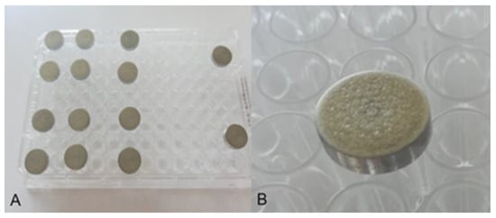 Stainless steel coupons (diameter 1.1284 cm) were used for biofilm formation. The coupons were previously washed in a rinsing agent solution and rinsed with sterile distilled water. They were then sterilised in an autoclave (Tuttnauer, ELV 3870, Bet Shemesh, Israel) at a temperature of 121 °C for 15 min. Each coupon was placed individually in the wells of a sterile 12-well polystyrene plate (Greiner Bio-One, Frickenhausen, Germany). The suspension of test bacterial isolates was inoculated in 100 µL onto the surface of each coupon. Adhesion of the bacteria was ensured during incubation at 25 °C for 48 h. During adhesion, the surface of each disc was inoculated with 100 µL of a bacterial suspension after 12 h and after 24 h. The bacteria were inoculated onto the surface of each disc. The discs prepared in this way were used for further treatment with the disinfectants tested (Figure 1).