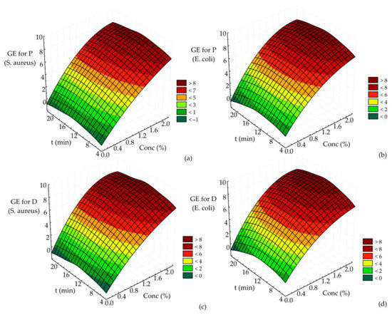 Based on the results for the germicidal effect of disinfectant P or D on reducing E. coli and S. aureus biofilms (Figure 3), it is clear that the maximum germicidal effect was achieved at the maximum disinfectant concentration at each time value. A similar effect was observed for each disinfectant P or D and the reduction of all E. coli or S. aureus biofilms (Figure 3a–d). In the case of disinfectant D (Figure 3c,d), the maximum GE (about 7.91) is observed at the highest values of the two parameters presented. On the other hand, the maximum value of GE for disinfectant P (about 7.77) was obtained at the same parameters (Figure 3a,b).