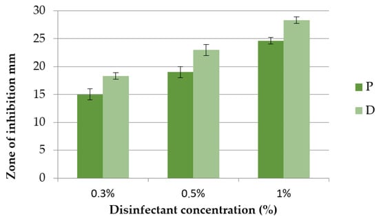 The results shown in Figure 3a–d suggest that the maximum germicidal effect of disinfectant P or D on the reduction of pre-formed E. coli and S. aureus biofilms was achieved at the highest values of disinfectant concentration (2%, regardless of disinfectant type, P or D).