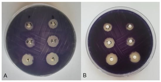 Inhibition zones of C. violaceum after exposure to P and D disinfectants at concentrations of 0.3% (first row of discs), 0.5% (second row of discs) and 1% (third row of discs). (A) Back view of the Petri dish: disinfectant P (first column of discs) and disinfectant D (second column of discs). (B) Display of the Petri dish so that the discs are in the foreground: disinfectant D (first disc column) and disinfectant P (second disc column).