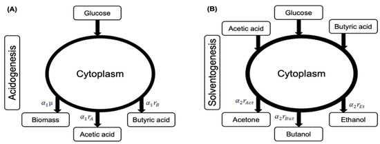 where, , ,, , , , and denote the yield coefficients (g·g−1) of glucose consumption with respect to biomass, acetic acid, butyric acid, acetone, ethanol, butanol formation, and carbon dioxide evolution, respectively. and indicate control coefficients for acidogenesis and solventogenesis, respectively.