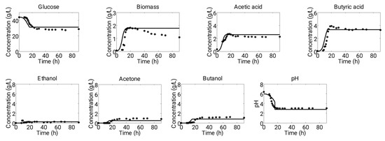 Figure 2 presents the simulation results in comparison with the fermentation data obtained from Experiment 1. During this experiment, the initial pH of 6.4 was maintained, but due to the production of a considerable amount of acetic acid (2.7 g·L−1) and butyric acid (3.9 g·L−1) in the first metabolic phase, the pH level dropped to 3.0. The metabolic activity of cells ceased once the pH level went below 3.0. During this phase, the maximum concentration of acids recorded during this phase was 1.8 g·L−1, while approximately 10 g·L−1 of glucose was consumed. Acid production was halted after 18 h of fermentation time, and at the same time, the biomass entered the stationary phase.