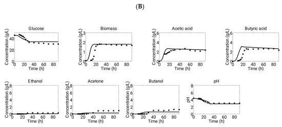 Demonstration of comparative profiles of experimental (dots) and simulation (solid lines) data of ABE fermentation in a batch process at starting of (A) pH 5.7 (“Experiment 2”) and (B) pH 4.4 (“Experiment 3”). These sets of experimental data were used to validate the predictions of model.
