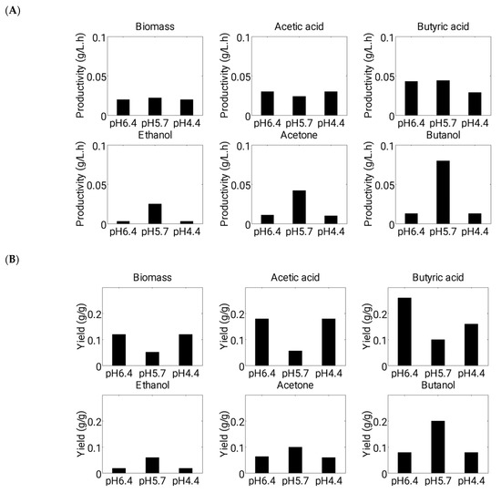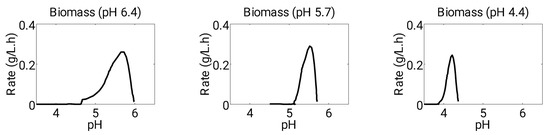 Although media pH is known to be a crucial factor for regulating biomass growth and the transition from acidogenesis to solventogenesis in Clostridium cultures [16,28,29], only a limited number of reports on ABE fermentation have investigated this variable. Incorporating pH into a physiological model can provide valuable insights for designing a fermentation process. Some studies have included pH dependence to develop mathematical models that were validated using experimental results from a continuous system [30,31]. However, these studies employed controlled pH profiles that were specific to each phase of fermentation (e.g., 5.7 for acidogenesis and 4.4 for solventogenesis).