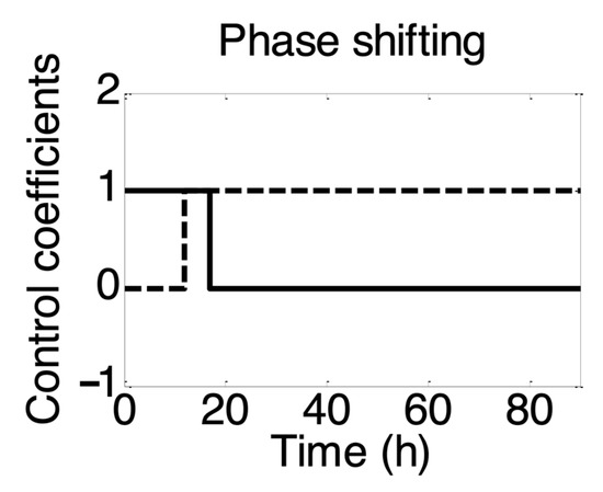 Representation of control strategy used in model to confine the metabolic transition from acidogenesis to solventogenesis. Figure shows profiles of control coefficients for acidogenesis (, solid lines) and solventogenesis (, dotted lines) over the time course of fermentation. The values of 0 and 1 of control coefficients ( and ) embrace switch-off and -on of production of each metabolite from specific substrate(s) consistent with the decision-making mechanism of the organism.