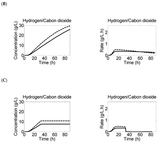 The figure shows predicted data of rates and production profiles of hydrogen (solid lines) and carbon dioxide (dotted lines) evolution at starting pH of (A) 6.4 (“Experiment 1”) (B) 5.7 (“Experiment 2”) and (C) 4.4 (“Experiment 3”).