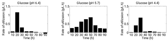 Furthermore, we conducted an analysis of glucose consumption rate, as well as the productivity and yield of fermentation products under various growth conditions (Figure 7 and Figure 8A,B). During acidogenesis, the consumption rate of glucose (g·L−1·h−1) was found to be higher in Experiment 1 and 3 compared to Experiment 2 (up to approximately 30 h) (Figure 7). Specifically, the starting pH of 6.4 enabled cells to consume glucose rapidly in the early stages of fermentation, as cells exhibited a higher growth rate and acid production at this pH level. However, after 30 h (during solventogenesis), the consumption rate of glucose was almost negligible at starting pH levels of 6.4 and 4.4 due to the unfavorable pH level (pH 3.0) reached by the culture. At a starting pH of 5.7, cells consumed a greater amount of glucose during solventogenesis than in acidogenesis, as carbon flow favored solvent production. The highest consumption rate was observed between 40 and 50 h of fermentation time, after which the rates decreased due to the accumulation of toxic products and a reduced amount of remaining glucose in the batch fermenter (Figure 7).