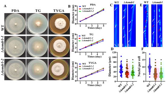 Comparisons of mycelial growth, septa, and nuclei of the WT and ∆Aomdr1 mutants. (A) Colony morphologies of fungal strains cultured at 28 °C for 5 days. (B) Comparisons of mycelial growth rates. (C) Observations of mycelial septa on PDA plates. White arrows indicate mycelial septa; scale bar: 2 μm. (D) Comparison of mycelial cell lengths. (E) Mycelial cell nuclei on PDA plates; scale bar: 2 μm. White arrows indicate mycelial septa and red arrows indicate nuclei. (F) Comparison of the number of nuclei. Asterisks indicate significant differences between the ∆Aomdr1 mutant and WT strains (Tukey HSD, * p < 0.05).