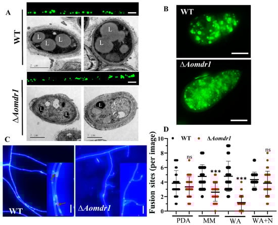 Comparisons of LD accumulation and mycelial fusion in WT and ∆Aomdr1 mutant strains. (A) LD accumulation in mycelial cells was observed with BODIPY staining (upper pane) and TEM images (lower pane). L indicates LDs; scale bar: 5 µm. (B) BODIPY staining of LDs in conidia; scale bar: 10 µm. (C) Observation of hyphal fusion in WA plates. The red arrows indicate the hyphal fusion sites; scale bar: 5 µm. (D) Comparison of the number of hyphal fusion sites under different media. The WT and mutant strains were observed using CFW staining for hyphal fusion after 5 days of incubation in PDA, WA, MM, and WA + N media, and 30 random photographs were used to count the number of hyphal fusion sites. The representative images in (A–C) were chosen from ∆Aomdr1-1 and ∆Aomdr1-2 mutants. Asterisks indicate significant differences between the ∆Aomdr1 mutant and WT strains (Tukey HSD; *** p < 0.001).