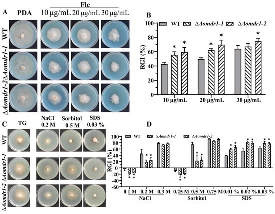 Comparisons of stress responses for fluconazole resistance, osmotic pressure, and SDS treatment. (A) Growth of WT and mutant strains under different concentrations of fluconazole. (B) RGI values of WT and mutant strains under fluconazole treatment. (C) Comparisons of mycelial growth after treatment with 0.2 M of NaCl, 0.5 M of sorbitol, and 0.03% SDS. (D) RGI values of WT and mutant strains under chemical stresses. Asterisks indicate significant differences between the ∆Aomdr1 mutant and WT strains (Tukey HSD; * p < 0.05).