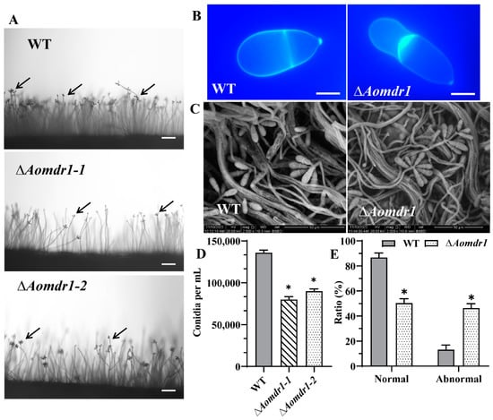 Comparisons of sporulation and spore morphology. (A) Observation of conidiophores of ∆Aomdr1 mutant and WT strains; scale bar: 50 µm. (B) CFW staining of spores of the ∆Aomdr1 mutant and WT strains; scale bar: 10 µm. The black arrows indicate the conidia. (C) SEM observations of spore morphologies of ∆Aomdr1 mutant and WT strains. The representative images in (B,C) were chosen from ∆Aomdr1-1 and ∆Aomdr1-2 mutants. (D) Comparison of the spore yield between the mutant and WT strains. (E) Percentages of normal and abnormal spores. A total of 100 random spores were used to calculate the ratio of normal and abnormal spores. Asterisks indicate significant differences between the ∆Aomdr1 mutant and WT strains (Tukey HSD; * p < 0.05).