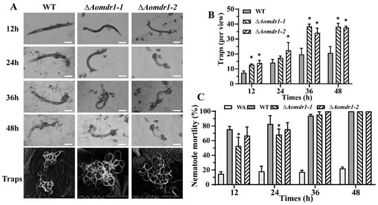 Comparisons of trap formation, morphology, and nematode predation efficiency. (A) Trap formation at different time points; scale bar: 50 μm. (B) Numbers of traps at different times of nematode induction. (C) Nematode mortality at different times. Asterisks indicate significant differences between the ∆Aomdr1 mutant and WT strains (Tukey HSD; * p < 0.05).