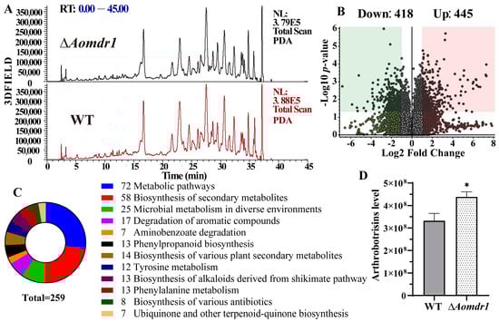 Comparisons of metabolic profiles of the WT and ∆Aomdr1 mutant strains. (A) Comparison of high-performance liquid chromatography profiles of the WT and ∆Aomdr1 mutants. (B) Analysis of the number of differentially up- and downregulated compounds. (C) KEGG enrichment analysis of differential compounds. (D) Comparison of the content of arthrobotrisins. Asterisks indicate significant differences between the ∆Aomdr1 mutant and WT strains (Tukey HSD; * p < 0.0 5).