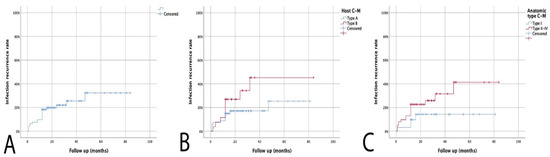 Further analysis of patients with a recurrence showed that failure to eradicate infection was significantly related to the physiological class of the host (p = 0.043) and anatomic type, with Type I CM having the lowest risk of IR (p = 0.047) (Figure 1B,C).