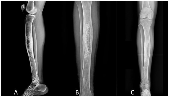 - Rousset, M.; Walle, M.; Cambou, L.; Mansour, M.; Samba, A.; Pereira, B.; Ghanem, I.; Canavese, F. Chronic infection and infected non-union of the long bones in paediatric patients: Preliminary results of bone versus beta-tricalcium phosphate grafting after induced membrane formation. Int. Orthop. 2018, 42, 385–393. [Google Scholar] [CrossRef]