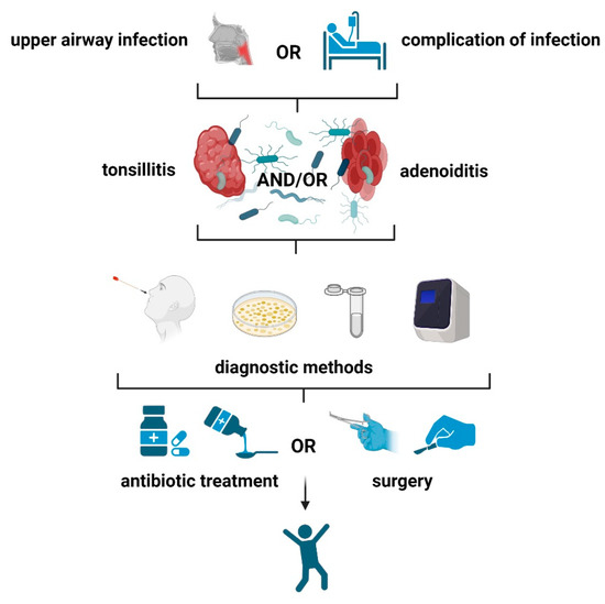 This “algorithm” outlines the general steps (diagnosis-conservative therapy-surgical procedures) to be followed in cases of upper respiratory infections (tonsillitis, adenoiditis, or adenotonsillitis) for appropriate pathogen treatment. Created with BioRender.com (accessed on 29 May 2023).