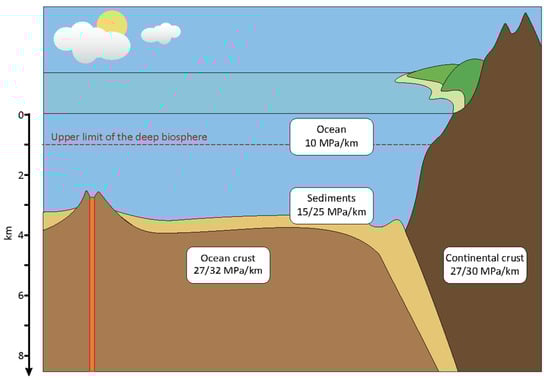 Schematic showing different deep biosphere environments and associated pressures (Modified from Oger and Jebbar []. Copyright © 2010 Elsevier Masson SAS. All rights reserved.).