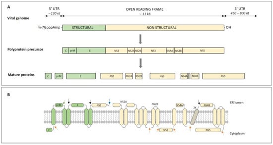 The virus genome is translated into a single polypeptide molecule (~3400 amino acids). The primary translation product is then co-translationally and post-translationally cleaved at specific sites by host and viral proteases. Thus, three structural and seven nonstructural proteins are produced, which participate in virus replication [,]. Host signal peptidases cleave the polyprotein at the C/prM, NS2A/NS2B, NS2B/NS3, NS3/NS4A, NS4A/2K, and NS4B/NS5 junctions. The serine protease of the virus cleaves the polyprotein at the junctions prM/E, E/NS1, and 2K/NS4B []. It is not known which enzyme is responsible for cleaving the contact between NS1 and 2A (Figure 1) [].