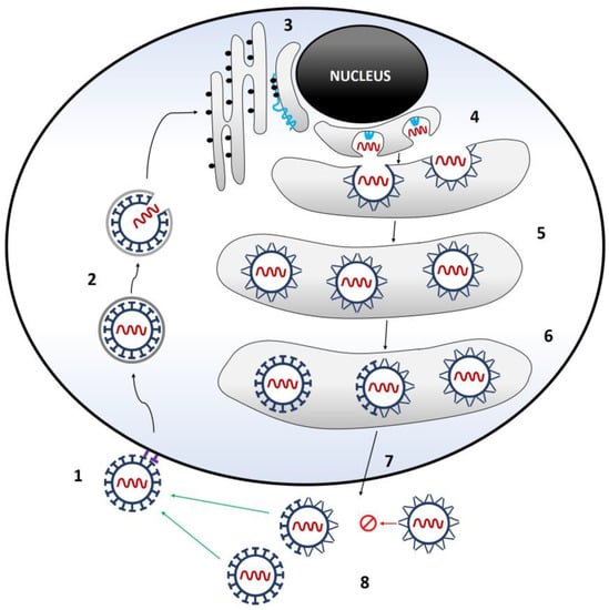 The genome of the virus is a positive-sense single-stranded RNA, approximately 11,000 nucleotides long. Genomic RNA is infectious and is the only viral mRNA present in infected cells []. It consists of two short non-coding sequences at the 5′- and 3′- ends and one open-reading frame (ORF), which is approximately 11,000 nucleotides long. After translation and processing of the viral genome, 10 different proteins are produced, three structural (C, prM, and E) and seven nonstructural (NS1, NS2A, NS2B, NS3, NS4A, NS4B, and NS5) [,]. The 5′-short non-coding sequence is approximately 130 nucleotides long and contains a type-I cap (m-7GpppAmp) followed by two conserved AG dinucleotides. The length of the 3′-short non-coding sequence can vary from 450 to 800 nucleotides and it may contain an internal poly-A tail [,]. RNA noncoding sequences create secondary structures that participate as cis-regulatory elements in genome replication, translation, and viral particle assembly []. The virus genome has three different roles: (1) as messenger RNA (mRNA) for the translation of viral proteins, (2) as a template for RNA amplification, and (3) as genetic material stored in new viral particles (Figure 1) [].