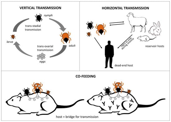 Ticks at all developmental stages can transmit the virus to humans. Unlike rodents, humans do not develop high enough viremia to become infectious for ticks []. Ticks usually do not feed on humans in large numbers or closely enough to each other to allow transmission through co-feeding [].